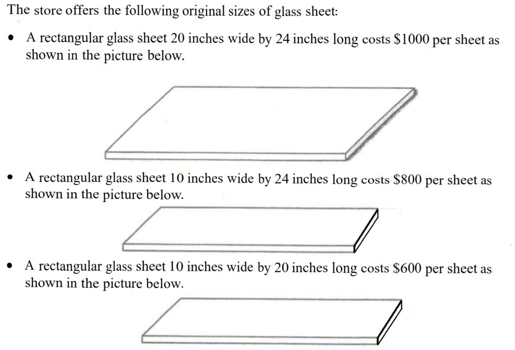 The principal would like the fish tank to be 10 inches deep. You must buy glass sheets to construct the fish tank as seen below.